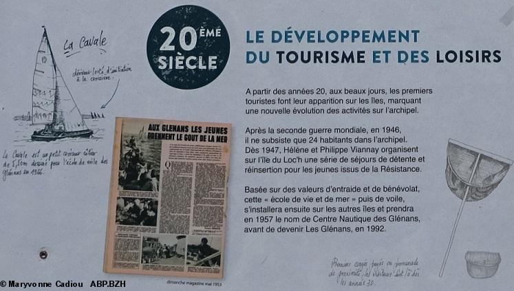 Extrait du PDF 2 de la Ville de Fouesnant qui donne le panneau entier posé sur l'île et un texte sur l'histoire des Glénan : L’entreprenant baron Fortuné Halna du Fretay (1832-1908) établit cinq familles de fermiers-goémoniers du Léon dans les îles de Saint-Nicolas, Penfret, du Loc’h, Drenec et Quignenec. Il fait aussi bâtir sur l’île du Loc’h un four à goémon de grande taille, qui fonctionnera peu et dont on aperçoit encore aujourd’hui la cheminée de briques. En 1870, le baron fait construire à Saint-Nicolas une nouvelle cale et un vivier très moderne pouvant contenir 60.000 à 70.000 crustacés. Dès lors, une centaine de caseyeurs vendent sur place leurs prises et restent dormir dans l’archipel, « La pêcherie des îles Glénan » approvisionne ainsi tout le continent. Le Pdf étant trop lourd (9 Mo) vous le trouverez sur http://ville-fouesnant.fr/larchipel-des-glenan-au-fil-des-siecles