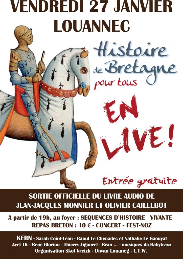 Les auteurs et toute l'équipe musicale du livre-CD qui vient de sortir aux éditions Skol Vreizh ont réalisé une première à Louannec le vendredi 27 janvier : ils ont offert aux nombreux Trégorrois venus fêter l'événement un véritable spectacle bâti autour de l'Histoire bretonne, avec des conversations en direct entre le journaliste animateur et l'historien, entrecoupées de compositions musicales originales ou d'interprétations de musiques liées à l'histoire. On citera à titre d'exemple des chansons et musiques composées à l'époque d'Anne de Bretagne et interprétées par Raoul Le Chenadec et Nathalie Le Gaouyat , des chants d'origine lointaine telles la Gwerz maro Ponkalleg ou An Alarc'h sur le retour du duc Jean IV. Mais aussi des interventions de comédiens mettant en évidence des textes ou des jugements d'époque, notamment ceux qui témoignent d'un ostracisme anti-breton qui appartient, en principe, au passé.