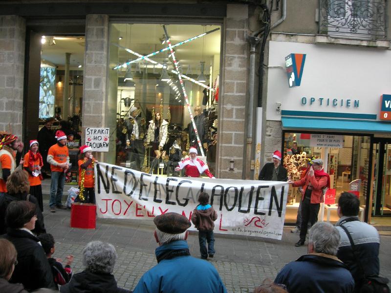 Ur bochad tud \\\'oe en em gavet eno da reiñ dehi o lizher Nedeleg, ebrezhoneg pe e galleg, hag a voe troet a vouezh uhel get un den ag ar strollad. Un digarez a-feson da reiñ brezhoneg da glevout da dud Gwened kement ha da ziskouez dehe eo bev-mat hor yezh ha komzet get paotred ha merc\\\'hed yaouank, lan a vudjon hag a fent !