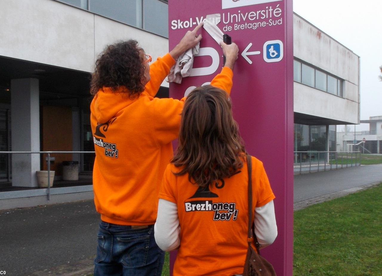 En octobre 2013, l'Université de Bretagne Sud (UBS) inaugurait le nouveau bâtiment de la faculté de Droit et la nouvelle signalétique monolingue du Campus de Tohannic sur Vannes. Son inauguration en présence d'élus avait été quelque peu perturbée par la pose d'autocollants « E brezhoneg ! en breton » sur l'ensemble du site.