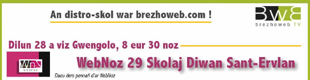 Un abadenn veur eo WebNoz, kinniget gant Lionel Buannic war-eeun bep miz. An daou dem pennañ d'ar WebNoz 29 : Skolaj nevez Diwan 'ba Sant-Ervlan : penaos eo bet kont d'an distro-skol ? - Breizh 5 departamant : e pelec'h 'omp erruet ganti ?