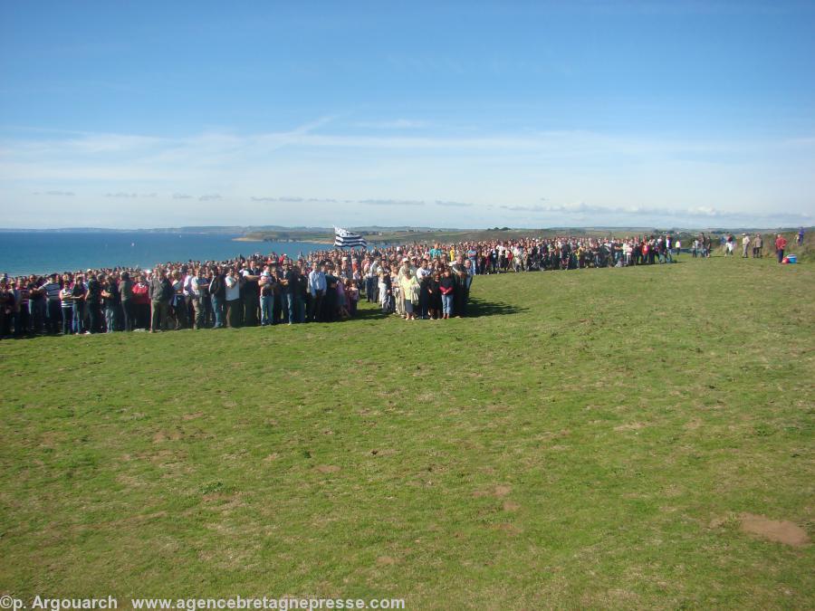 Environ 1500 personnes, agriculteurs avec femmes et enfants, avaient rejoint la manifestation paysanne organisée par CAP Bretagne (1) sur un champ en haut de la colline face à la plage de Sainte-Anne la Palud. Venus de tout de bassin de la baie qui regroupe 400 exploitations entre, au nord le Menez Hom, à l'est Locronan et au sud la ville de Douarnenez, les manifestants se sont abreuvés à une buvette où l'on servait du lait gratuit et des saucisses gratuites aussi. L'événement fut une fresque humaine formant les mots "Vivre Ici".