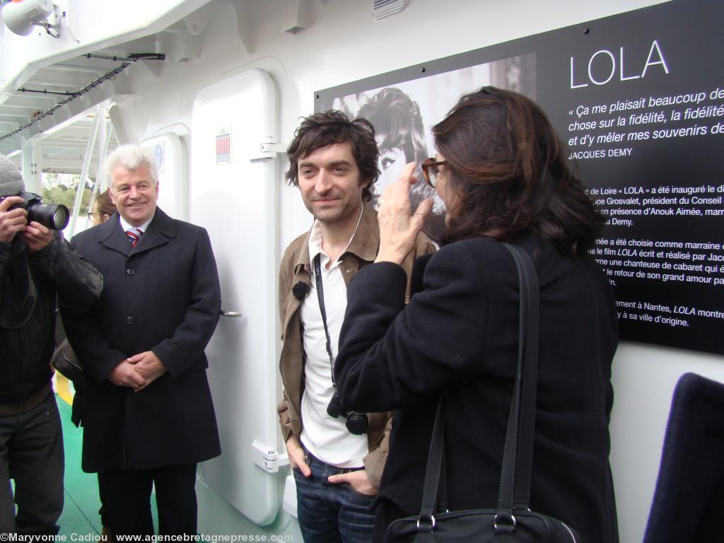 En attendant l'arrivée des invités à bord, Philippe Grosvalet (1), en présence de Daniel Morrisson (2), Jean-Pierre Fougerat (3), Patrick Mareschal (4) et Valérie Demangeau (5), nous informe que les idées, et du nom de ce nouveau bac de Loire, et d'inviter Anouk Aimée à son inauguration viennent de Patrick Mareschal. Pour lui « Lola, ça me parle, c'est local, nous avons aussi les chanteurs nantais Hélène et Jean-François, qui ont chanté “La chanson de Lola”. La parenté de sonorité avec “Lila” [le nom du réseau de cars départementaux] tombait bien aussi ». Valérie Demangeau précise que « la décision de gratuité a entraîné une augmentation importante de la fréquentation des bacs » (1er septembre 2005). On peut ajouter que la Compagnie des bacs de Loire est le premier transporteur maritime de passagers en France, devant la SNCM (Corse-continent) et Brittany Ferries (transmanche) avec en 2008 près d'un million de véhicules et près de deux millions de passagers http://www.presseocean.fr/actu/actu_detail_-Des-capitaines-traversiers-_9179-1010287_actu.Htm?xtor=RSS-4&utm_source=RSS_MVI_presseocean&utm_medium=RSS&utm_campaign=RSS de Presse Océan, article de 2008.Passerelle, personnel et visite machine