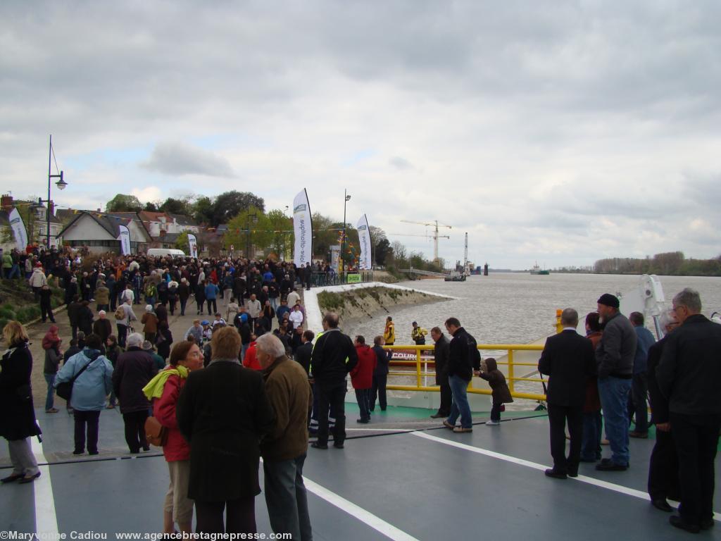L'inauguration se passait au Pellerin, comme annoncé, oui, mais ceux qui ont eu la bonne idée et la possibilité de venir à l'embarcadère de Couëron ont eu la chance, et de voir les invités d'honneur embarquer sur le bac et de monter à bord pour sa première traversée de la Loire ! Après son baptême