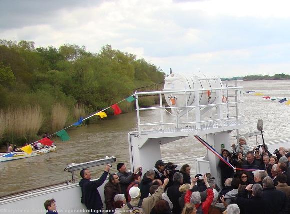 Il remercie les invités, précise que ce bac « est une réussite économique et cela participe au patrimoine industriel de notre territoire ». En tout, il a demandé près de 100.000 heures de travail pour sa construction entièrement réalisée en Loire-Atlantique. « Aujourd'hui, sa capacité et sa performance technique formeront l'un des symboles de Loire-Atlantique ». Il donne les caractéristiques de ce nouveau bac : 46 m de longueur de coque, longueur totale de 66 m, sa plus grande largeur (ou largeur hors membres) : 12,50 m, le creux (du pont principal à la ligne de quille) : 3,25 m, quatre voies pour les voitures longues de 46 m soit de la place pour environ 40 véhicules légers (au lieu de 27, 18 et 12 pour les autres). À la vitesse de 8 noeuds il passe en face toutes les dix minutes.