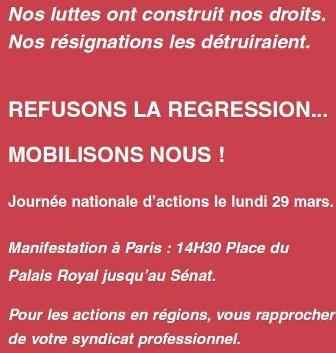 Appel à manifester à Paris le 29 mars 2010 à partir de 14 h 30 et pétition à signer. Trajet : Palais Royal (rive droite) au Sénat (rive gauche).