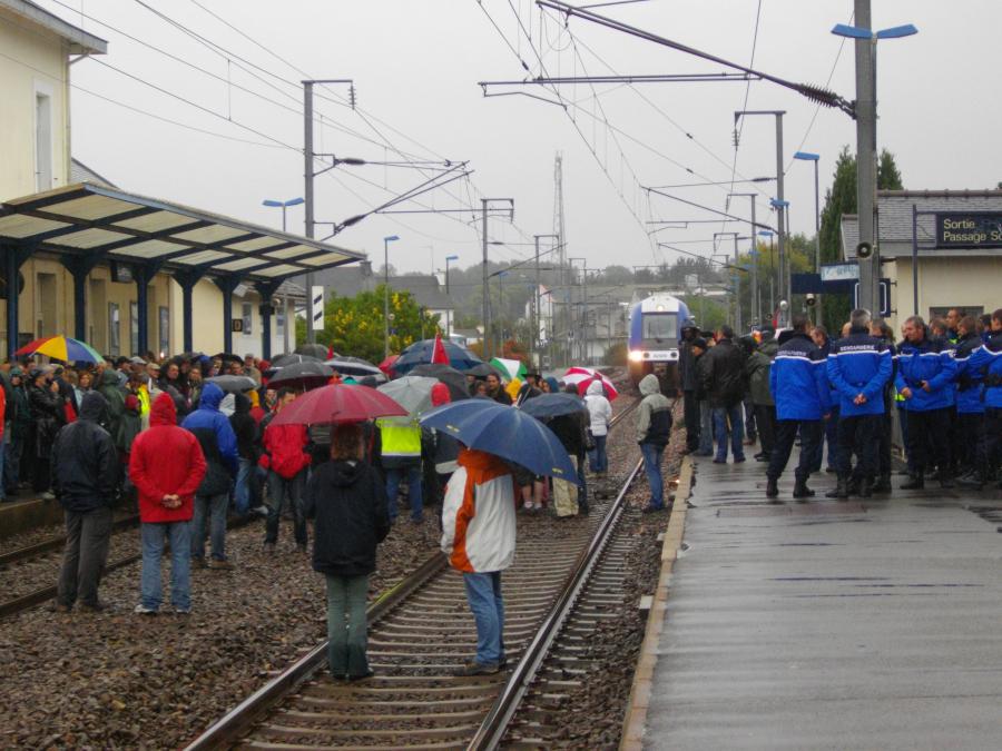 Une poignée va sur le quai et le train régional, lentement s'arrête. Les manifestants, une centaine, occupent alors la voie pendant au moins une demi-heure. Les gendarmes présents cherchent à faire évacuer les rails, mais les slogans fusent et la plus grande partie s'assoit, rendant impossible la dispersion.