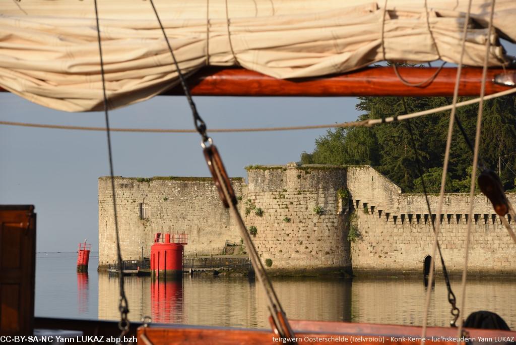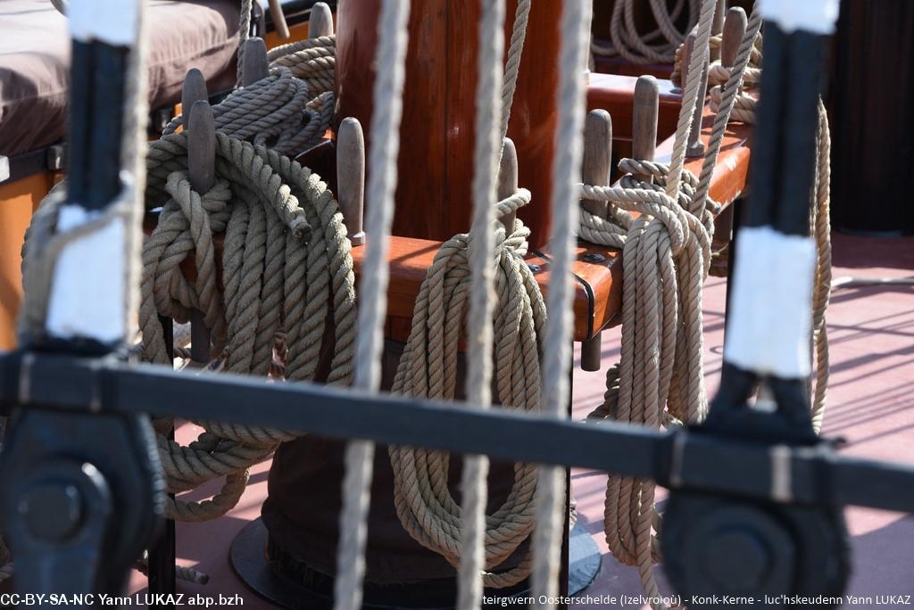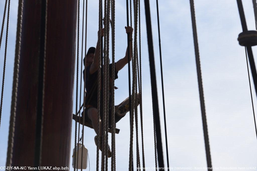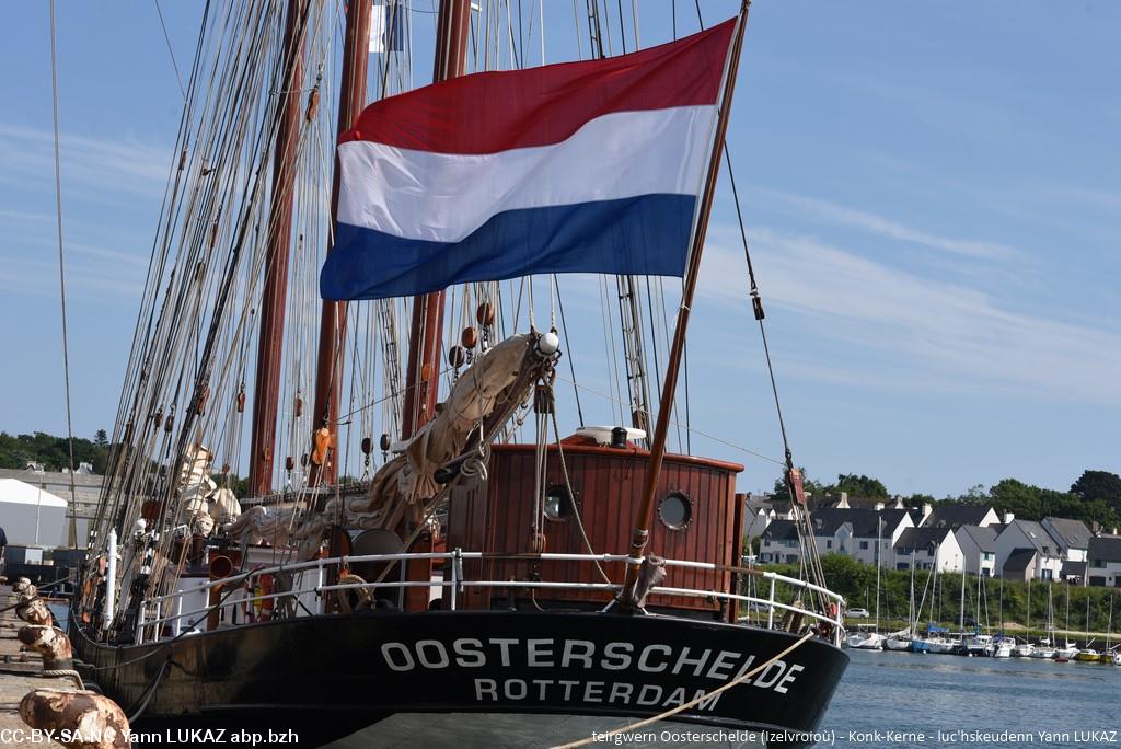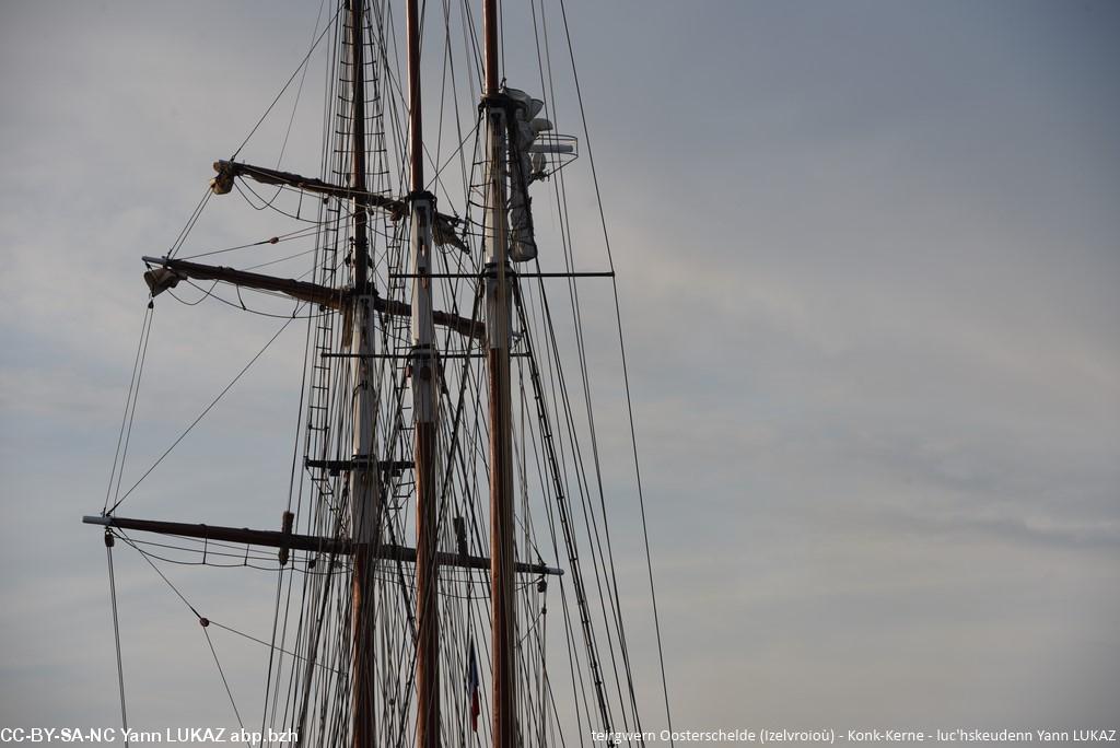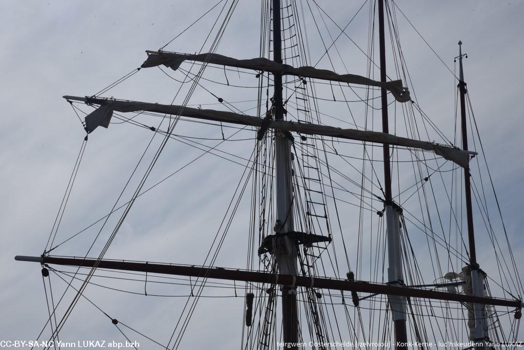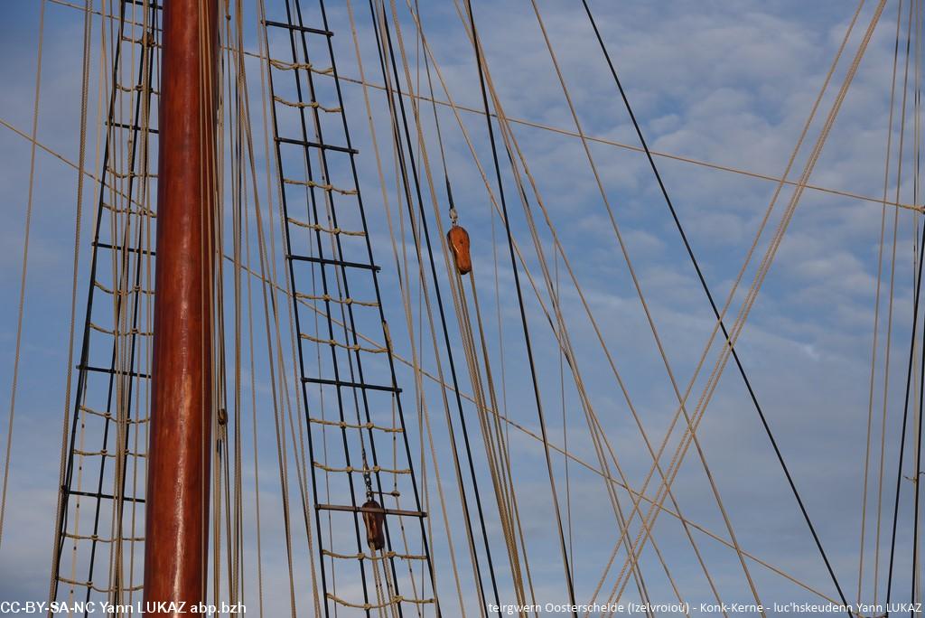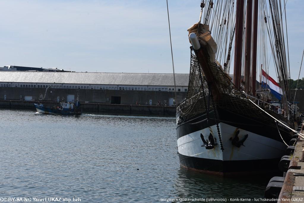 Setu ar vag. Ur oueletenn ( « Schooner » e saozneg) ez eo : dezhi teir wern. Pleget he gouelioù gwenn …Koadoù al leurenn (ha reoù all) koaret brav ha lufrus dindan an heol. Un añv izelvroek, iskis un tammig, zo dezhi: « Oosterschelde » ! An añv-se a dalv un dachennad mor (lâret e vez eus Escaut oriental, e galleg) e su an Izelvroioù. Diaes eo da zistagañ. Goulennet eo bet digant ur martolod d’e zistagañ. Adgoulennet diouzhtu, ken diaes eo… ! Ur skritell (e saozneg) lakaet e-tal dezhi a c’heller lenn evit kaout sifroù resis.