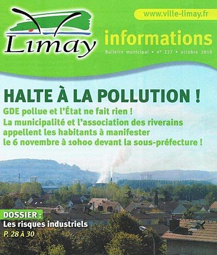 http://www.ville-limay.fr : Sur proposition du maire, Éric Roulot, la municipalité unanime (majorité et opposition), réunie le 29 septembre, a décidé d'appeler les Limayens à manifester samedi 6 novembre devant la sous-préfecture, à 10 h, contre GDE qui ne cesse de polluer. Cet appel est aussi un message fort qui est envoyé à l'État, et notamment au ministre de l'Écologie, M. Borloo, qui n'a pas répondu à la demande de la ville et de ses habitants : suspendre l'activité de GDE.
