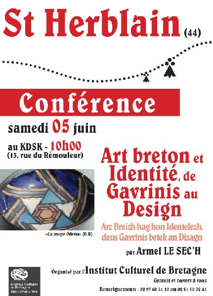 Armel Le Sec'h, artiste peintre bretonne de Poellgor an Tarv, l'Académie bilingue des Arts de Bretagne, donnera une conférence à Saint-Herblain sur le thème Art breton et Identité, de Gavr'Inis au Design « Les sculptures et les monuments d'abord, la peinture et la photo ensuite, ont “sculpté” notre identité et notre âme, et dans un même temps ont donné au monde l'image incomparable d'un pays rayonnant. » http://www.kdsk-bzh.org:8080/Record.htm?record=19131376124919595589&context=1&heading=Armel+Le+Sec%27h%8A&Lang=BR Le samedi 5 juin à 10 heures, proposée par l'Institut Culturel de Bretagne (ICB) en partenariat avec le Centre de Ressources Culturelles Celtiques (KDSK) et Yezhoù ha Sevenadur, dans ses locaux, 13, rue du Remouleur à Saint-Herblain. Jusqu'au 15 juin KDSK propose une exposition de livres sur l'art celtique, les entrelacs et les "mandalas".Voir la biographie d'Armel Le Sec'h – en français – par Hélène Cadou : http://www.temps-a-naitre.com/pageshtml/lesech.html http://sitekreator.com/ArmelLeSech/main_page.html d'Armel et