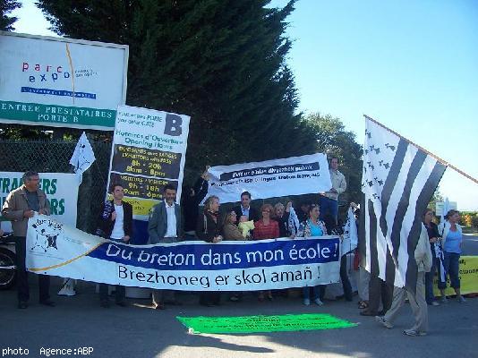 ]ABP] Saint-Jacques de la Lande, le 11 septembre 2007 Une quarantaine de personnes ont répondu à l'appel du collectif des parents d'élèves de Guichen à 8h00 ce matin au salon SPACE à l'occasion de la visite du président Nicolas Sarkozy au salon SPACE à Saint-Jacques-de-la-Lande. Etaient notamment présents Léna Louarn et Olier ar Mogn, dirigeants de l'Office de la Langue Bretonne, Mona Bras, conseillère régionale, ainsi que des membres de l'UDB et des Jeunes Bretons (mouvement des jeunes du Parti Breton). Ils étaient venus réclamer l'ouverture d'une classe bilingue à Ploeren et une autre à Guichen. En effet, l'inspection d'acadélmie a refusé l'ouverture de classes bilingues sur ces 2 sites alors que toutes les conditions sont remplies (soutien de la mairie et nombre suffisant d'élèves). A 11h00, ils n'avaient toujours pas obtenu d'entrevue à la préfecture ni pu rencontrer Nicolas Sarkozy au SPACE. Par ailleurs, une vingtaine de manifestants anti-OGM ainsi que des militants pour la régularisation des sans-papiers étaient présents à différents endroits du site.