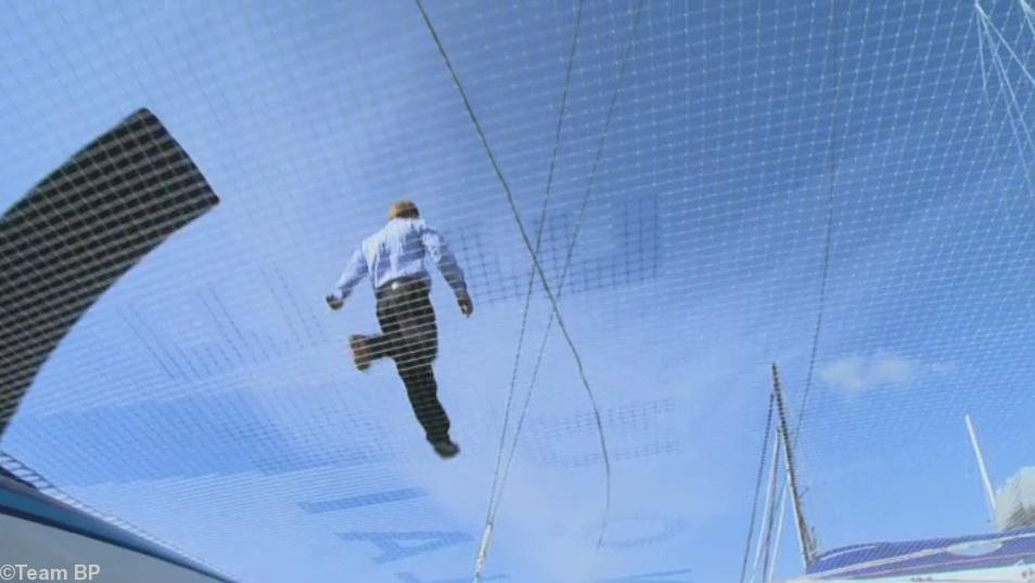 En tête de mât et à 45 mètres du sol (aussi haut que l'Arc de Triomphe), Kévin Escoffier – responsable du bureau d'étude et navigant à bord du bateau en tant que barreur/régleur