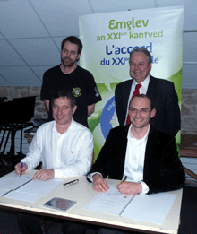 Dirak Tangi Thomin, den dave « Ya d'ar brezhoneg », Thierry Chapelet, prezidant kozh ar bagad ha Yann-Bêr Thomin, kuzulier-rannvro e karg eus ar politikerezh yezh e oa bet roet gant Fulup Jakez, rener an Ofis, al label live 1 d'ar bagad.