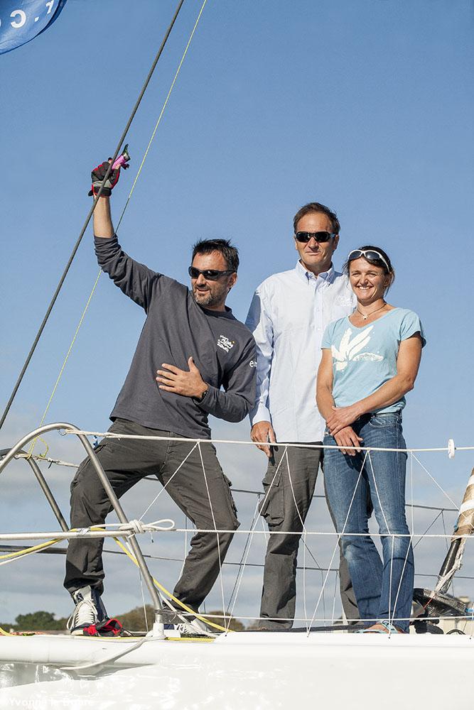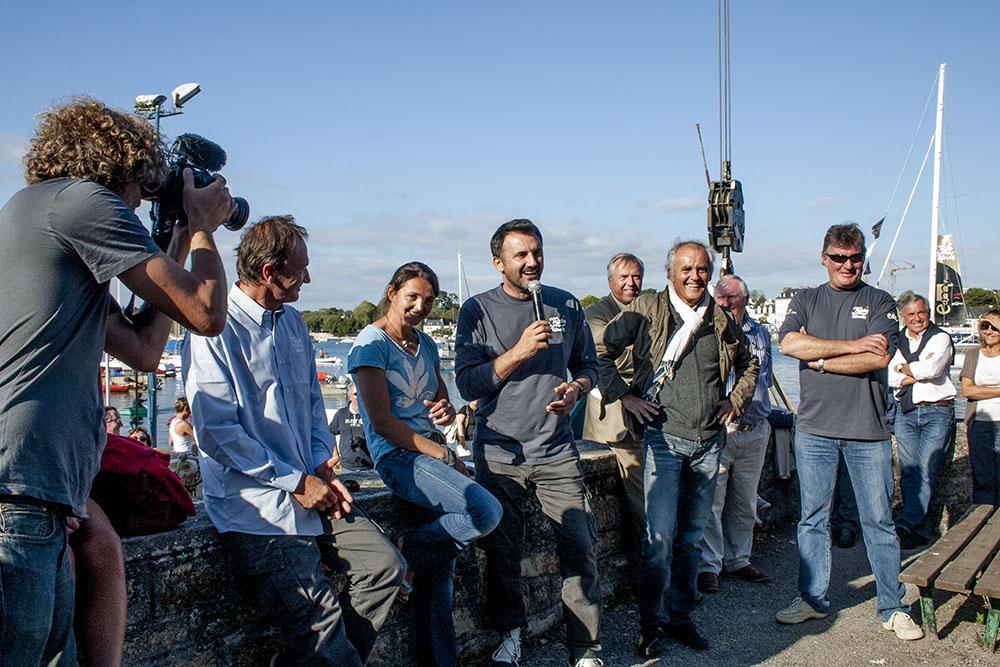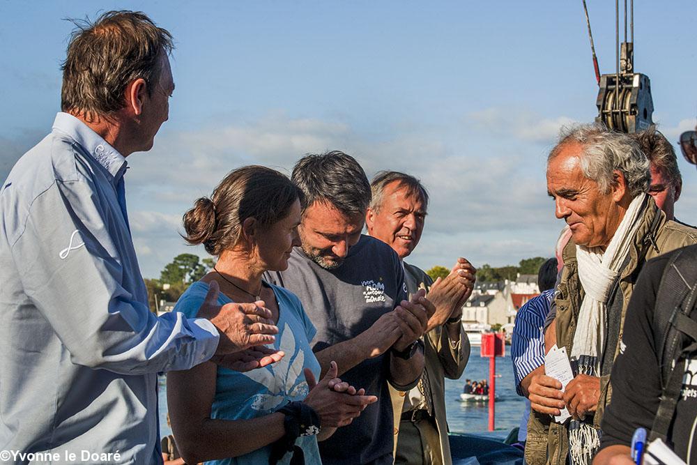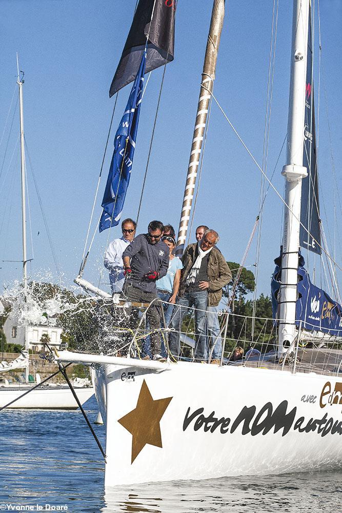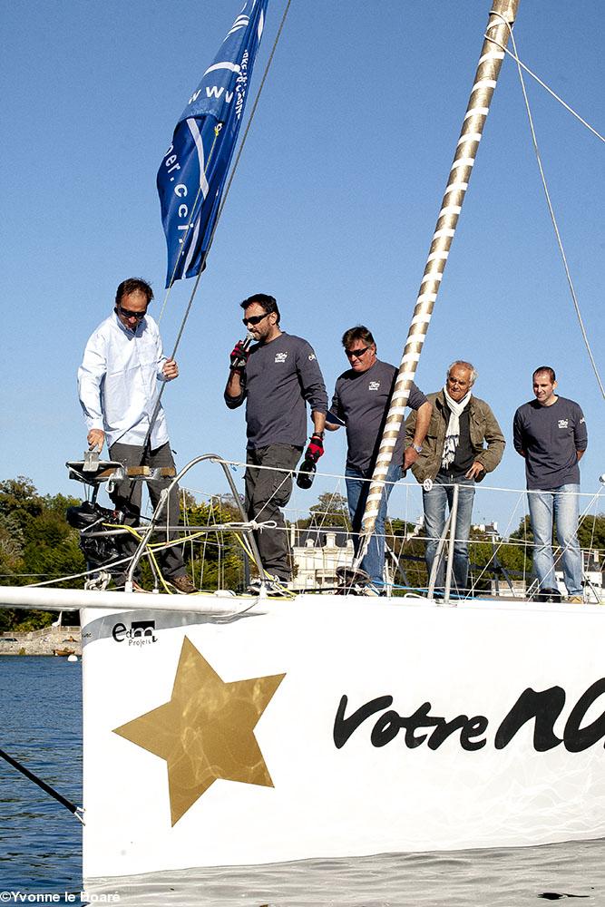 - Votre nom autour du monde amarré au port de Sainte-Marine. A bord Bertrand de Broc et les trois parrains et marraine du légendaire bateau de course