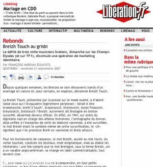Le journal Libération publie ce matin dans sa rubrique "Rebonds" un pamphlet de Françoise Morvan. Egale à elle-même, l'anti-communautariste y compare les bretons à des bestiaux...