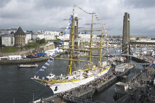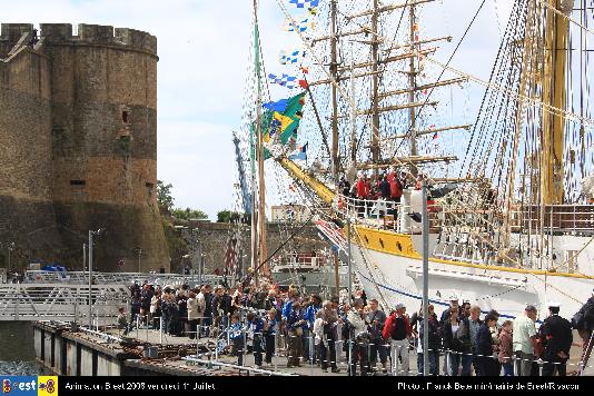 Les hommes de la Marine Nationale les attendaient ainsi que les 64 membres d'équipage du trois-mâts roumain, le Mircea à bord duquel François Cuillandre a fait sonner la corne de brume, lançant officiellement Brest 2008. Sous les remparts, le soleil a percé les nuages comme seuls savent le faire les rayons bretons. La fanfare la Marine Nationale a joué, une funambule a dansé dans les airs, les coups de canons ont retenti…