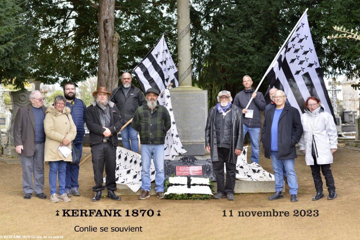 En ce 11 novembre 2023, l'association Koun Breizh-Bertaign Tenant-Souvenir de Bretagne a voulu rendre hommage aux Bretons sacrifiés du camp de Conlie, mobilisés sur ordre de Gambetta lors de la guerre de 1870. Une gerbe a été déposée par des militants au pied de la Croix aux Bretons se trouvant au cimetière de Conlie. S'en est suivi un moment de recueillement, puis plusieurs prises de paroles, parmi lesquelles celle de Jean-Luc Laquittant pour Koun Breizh. Des liens ont été créés avec une jeune association locale : KERFANK 1870 Conlie se souvient, se donnant pour mission de perpétuer la mémoire du camp et des Bretons de Conlie. Une commémoration, tous les deux ans est envisagée par cette association.