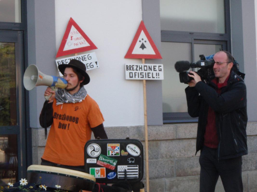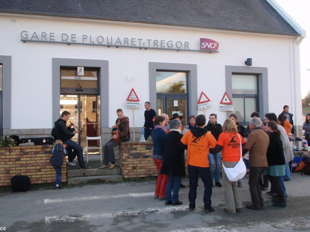 Une cinquantaine de personnes a pris part au fest-deiz d'Ai'ta ! devant la gare de Plouared afin de rappeler une fois de plus à la SNCF notre volonté de voir notre langue présente à parité avec la langue française dans la nouvelle signalétique, à l'issue des travaux. La vigilance est de mise, car jusqu'à présent, la langue bretonne brille par son absence. L'action s'est déroulée sans incident et dans un climat bon enfant… en espérant que le message soit compris par les différents responsables (SNCF, RFF, élus régionaux et locaux) qui se réuniront justement mardi à Plouared. Car, si tel n'était pas le cas, nous risquons fort de changer de musique la prochaine fois…