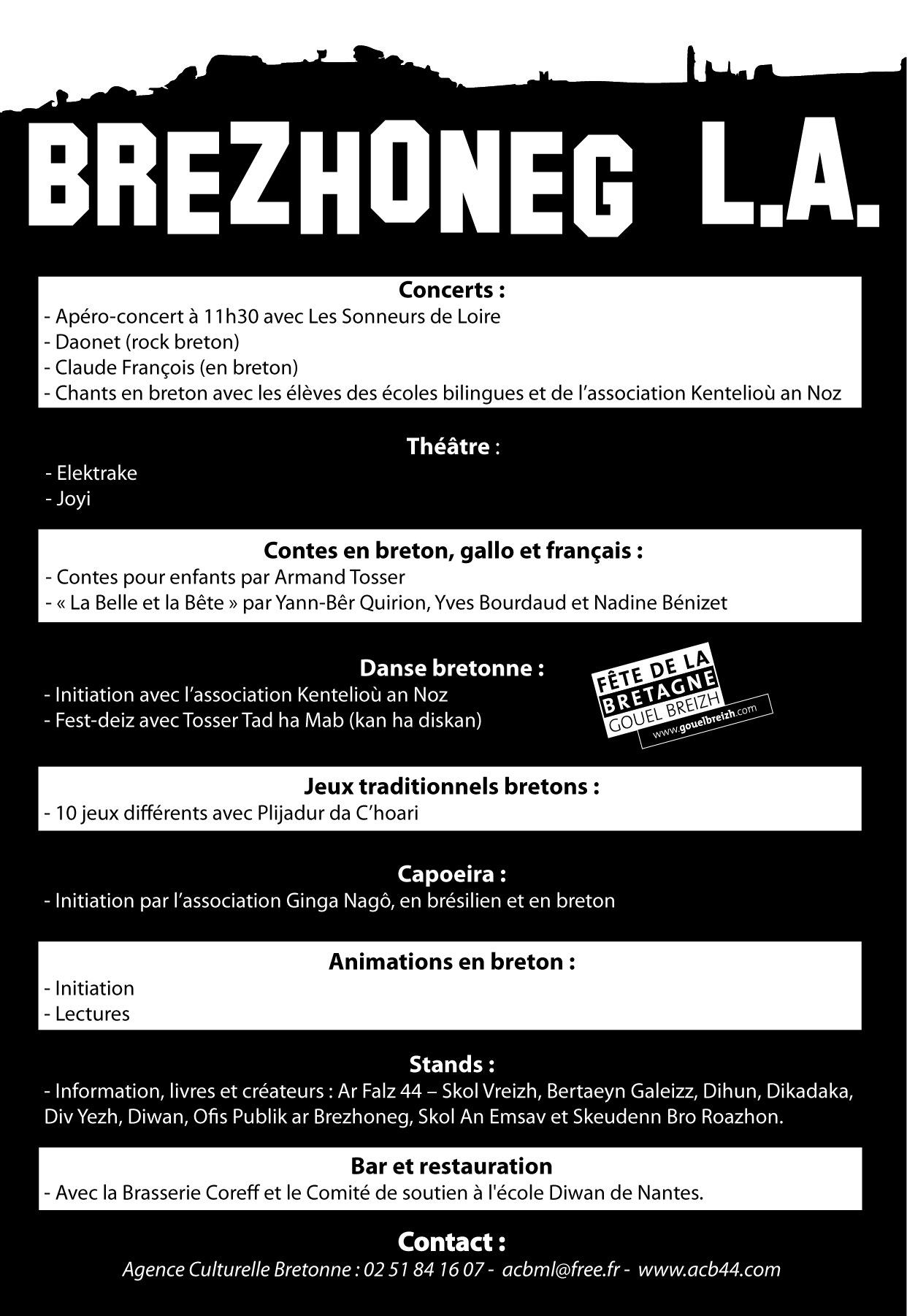 "Brezhoneg L.A." est un événement tout public qui s'adresse à la fois aux locuteurs brittophones et à ceux qui désirent découvrir la langue bretonne, les animations étant proposées en breton et en français. Le gallo aura sa place avec un stand d'information et la présentation du conte « La Belle et la Bête » en gallo, en breton et en français. La fête s'ouvre aussi à un autre pays et une autre langue : le Brésil et le portugais avec l'association Ginga Nagô qui proposera une découverte de la capoeira.