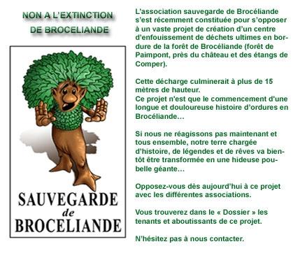 « L'association Sauvegarde de Brocéliande s'est récemment constituée [2004] pour s'opposer à un vaste projet de création d'un centre d'enfouissement de déchets ultimes en bordure de la forêt de Brocéliande (forêt de Paimpont, près du château et des étangs de Comper). »