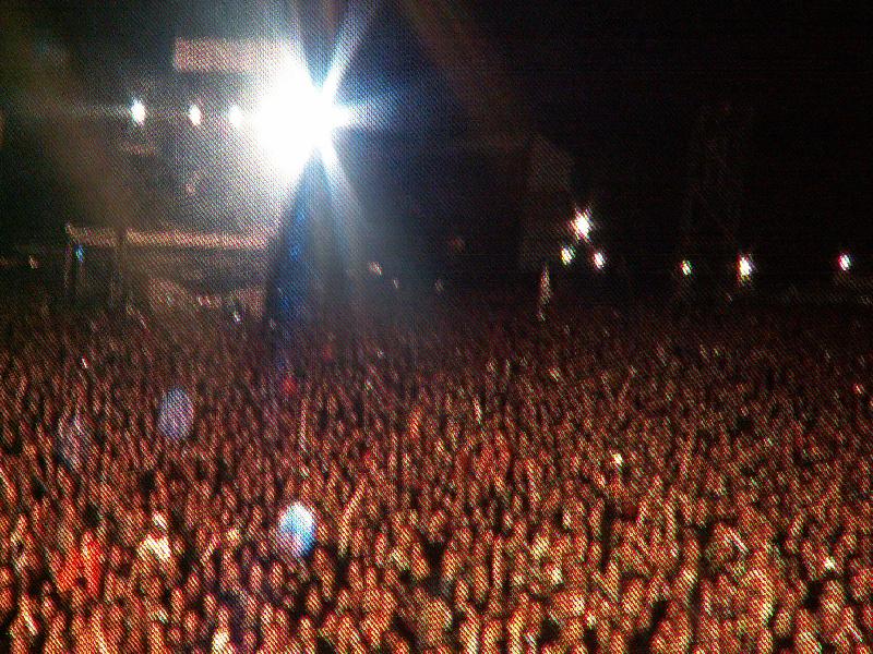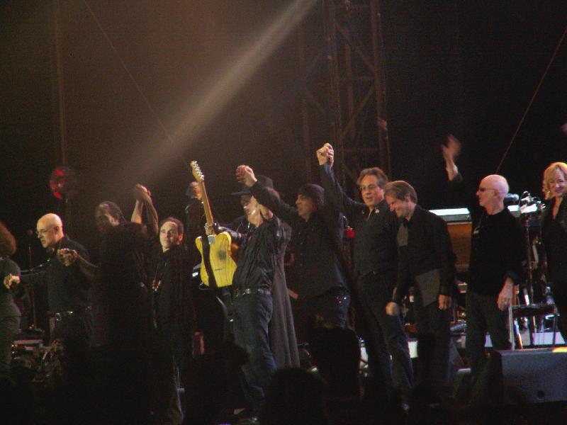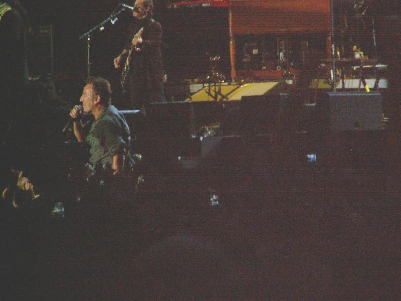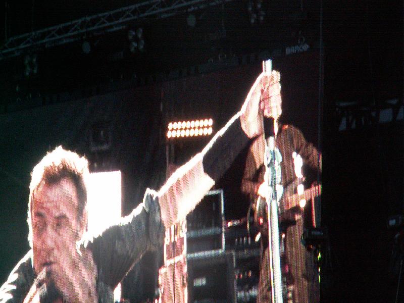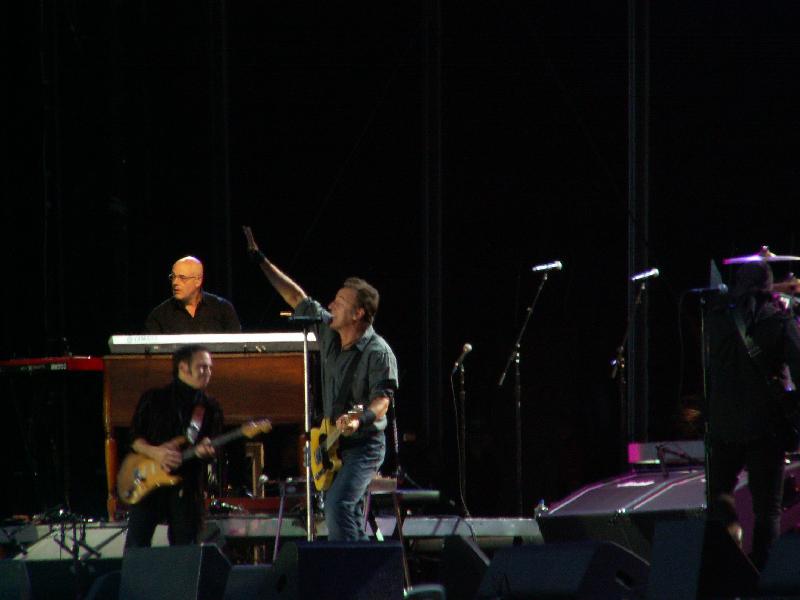 Le complément de celle-ci, en contrebas de la scène principale, aménagée pour l'occasion a transformé Keramphuilh, immense, en un club New-yorkais. En un terrain de foot anglais où les spectateurs sont séparés du capitaine par une seule petite balustrade. Le E-Street Band, séparé, reformé, à géométrie variable mais tous complices de longue date néanmoins, ont accompagné leur patron avec bienveillance, sympathie, amusement ; après tant d'années ils n'en reviennent toujours pas de l'énergie déployée par le phénomène. Tous les morceaux sont enchaînés, le concert est une machine à plaisir. Le rock vieillit bien. Même pour boire, Springsteen descend d'une main un grand gobelet et de l'autre continue à mouliner sur sa Telecaster. Pas moins de 8 guitares passent entre ses mains. Pas une seule fois vous le verrez tirer la gueule, il mène la danse du début à la fin, il ne lâche rien. C'est comme revoir un western de John Ford ou rouler dans une Chrysler de 1957, c'est "le vrai goût de l'Amérique" quoi... Celui d'un artiste qui ne renoncera jamais à son idéal de démocratie et de liberté. C'est pas un, deux, trois ou dix millions d'euros que valait la prestation d'hier, elle n'a pas de prix.