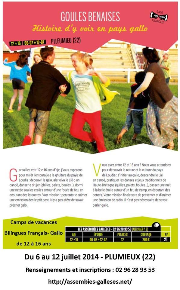 Dans le cadre des assembiées gallèses à Plumieux (22) deux camps gallo vous sont proposés. Un pour les petits 7-11 ans et un pour les ados 12-16 ans. C'est l'occasion de