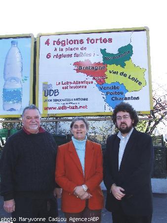 Mona Bras, porte parole de l'UDB, Michel François et Jef Monnier, de l'UDB ont présenté ce matin à Nantes la campagne d'affichage pour la réunification de la Bretagne qui propose aussi un nouveau découpage, cohérent, des régions de l'ouest de la France. La campagne débute aujourd'hui en Loire-Atlantique