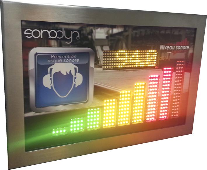 Installé au coeur d'un environnement industriel, le sonomètre Sonodyn™ affiche en temps réel le niveau sonore de l'environnement de travail, en chiffres et par le biais de barres lumineuses de couleurs différentes selon l'intensité sonore. Il indique en parallèle, sous la forme de pictogrammes, les équipements de protection à adopter en fonction du niveau sonore constaté . Pour les industries agro-alimentaires, le caisson est conçu en inox 304 dans les ateliers de chaudronnerie du groupe Bobet, afin de respecter les normes sanitaires liées aux industries agro-alimentaires (étanchéité, qualité de soudure, sécurité alimentaire...).
