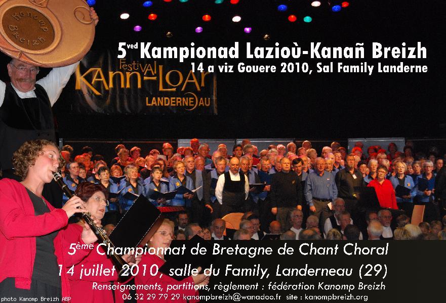 Les chorales de Bretagne et du monde sont invitées à venir se produire sur la scène du Family à Landerneau, dans le cadre du festival Kann al Loar, pour participer au Championnat de Bretagne. Ce concours de chant choral désigne chaque année le Champion de Bretagne des chorales ; il se déroule devant un jury composé de chefs de chœur, de musiciens, de chanteurs. Cette année, il sera présidé par Louise Ebrel, chanteuse traditionnelle de renom.