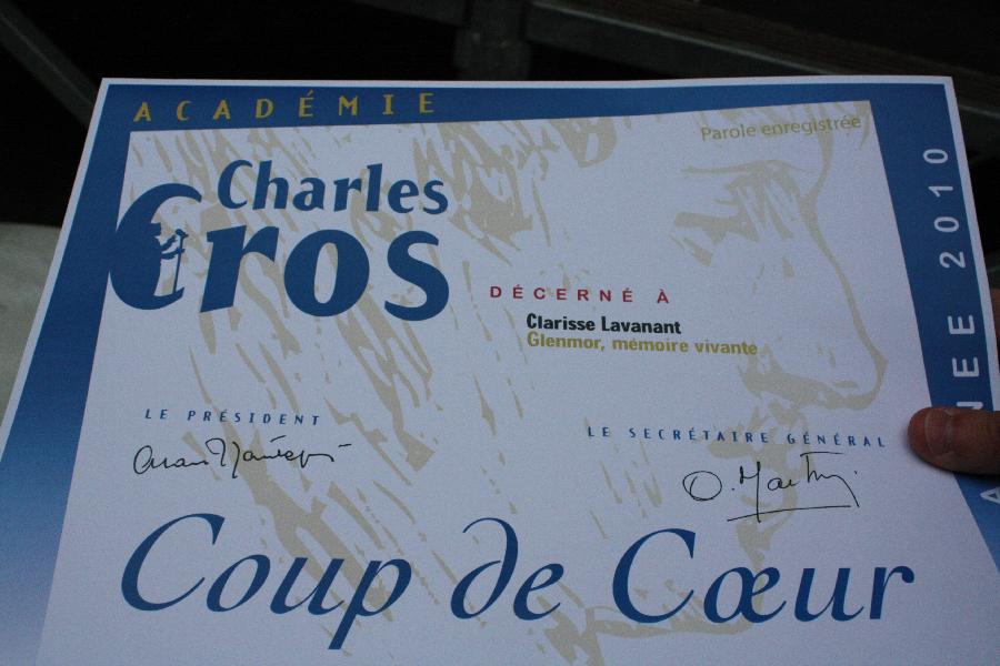 "C'est un grand plaisir pour moi d'être récompensée par une Académie aussi prestigieuse que l'Académie Charles Cros et c'est à la fois un grand honneur qui est rendu à la poésie de Glenmor. Glenmor est un pilier de la culture bretonne et sa poésie est tellement humaniste qu'elle est aussi universelle.