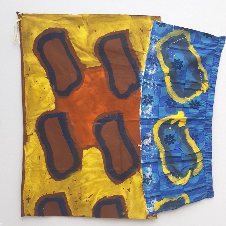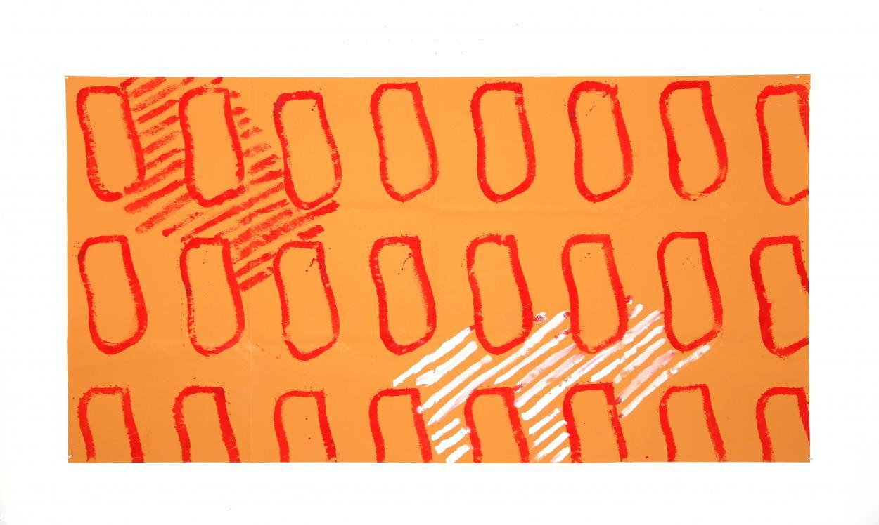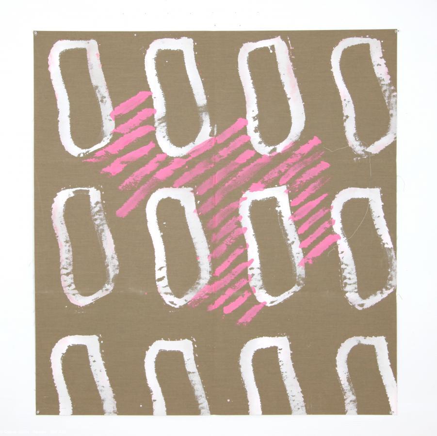 Cette forme simple, reproduite inlassablement à l’aide d’un pochoir et de pinceaux coudés de radiateurs sur des tissus colorés, induit sa part d’aléatoire par son exécution manuelle. La répétition et l’agencement de ce motif, unique à l’artiste, crée des espaces divers, modulés selon le jeu de textures et de couleurs des supports qui la portent. C’est la matière du support imprégné qui donne à la forme, en fonction de son tissage, de sa texture, un contour plus ou moins net, une intensité de ton plus ou moins forte.