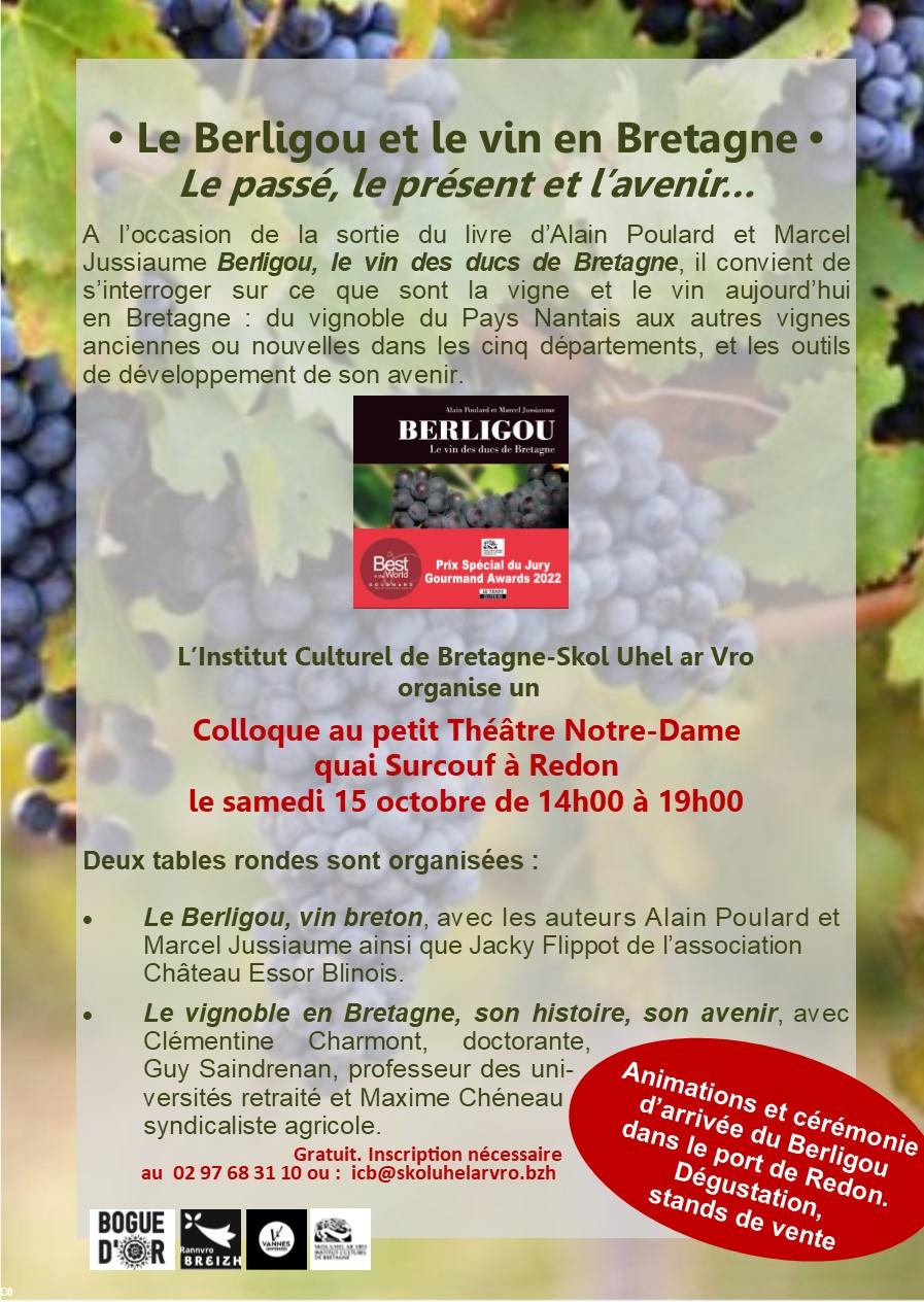 A l’occasion de la sortie du livre d’Alain Poulard et Marcel Jussiaume Berligou, le vin des ducs de Bretagne, il convient de s’interroger sur ce que sont la vigne et le vin aujourd’hui en Bretagne : du vignoble du Pays Nantais aux autres vignes anciennes ou nouvelles dans les cinq départements, et les outils de développement de son avenir. L’Institut culturel de Bretagne - Skol Uhel ar Vro organise un colloque au petit Théâtre Notre-Dame 3 quai Surcouf à Redon le samedi 15 octobre de 14h00 à 19h00