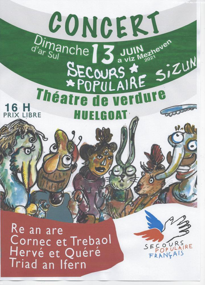 Le comité du Secours Populaire de Sizun vous propose un concert de musique traditionnelle et de kan ha diskan le dimanche 13 juin à 16h au théâtre de Verdure à Huelgoat (prix libre / conditions sanitaires respectées). Au programme : Cornec et Trébaol / Hervé et Quéré / Re an Are / Tri an Ifern Le produit des entrées ira au profit du comité du Secours Populaire de Sizun qui accueille plus d'une cinquantaine de familles en grande difficulté ou sous le seuil de pauvreté, issues de Sizun ou des communes avoisinantes.