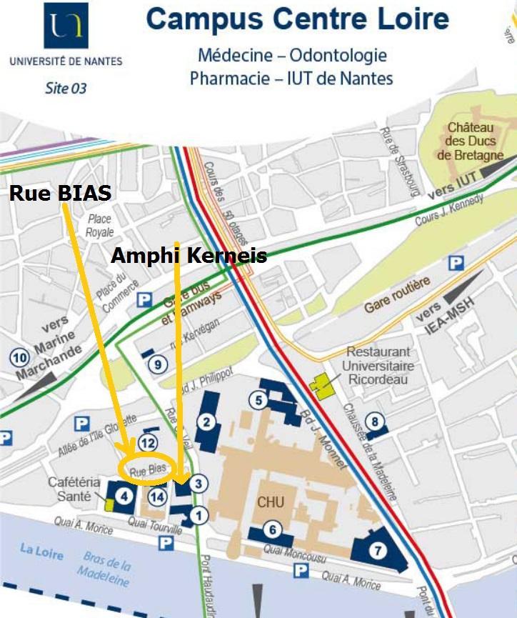 Amphithéâtre Kerneïs de la Faculté de médecine, 1 rue Bias, en centre ville. Voir plan d'accès (ill. n° 9).