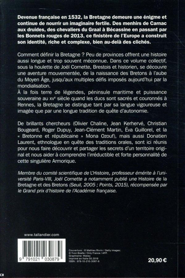 La Bretagne. Une histoire mondiale aux éditions Tallandier : Devenue française en 1532, la Bretagne demeure une énigme et continue de nourrir un imaginaire fertile. Des menhirs de Carnac aux druides, des chevaliers du Graal à Bécassine en passant par les Bonnets rouges de 2013, ce finistère de l’Europe a construit son identité, riche et complexe, bien au-delà des clichés. Dans ce volume collectif, sous la houlette du Brestois Joël Cornette, se découvre une aventure mouvementée, de la naissance des Bretons à l’aube du Moyen Âge, jusqu’aux multiples défis imposés aujourd’hui par la mondialisation.