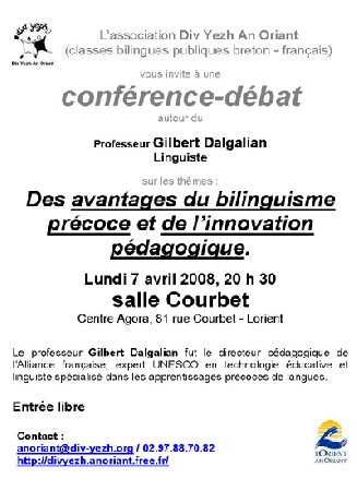 Le lundi 7 avril - 20h30 à Lorient, l'association Div Yezh An Oriant organise une conférence à la salle Courbet - Centre Agora (près de l'embarcadère de Groix). La conférence sera animée par le professeur Gilbert Dalgalian, sur le thème des avantages du bilinguisme précoce et de l'innovation pédagogique. Le