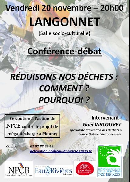 La conférence sera animée par Gaël Virlouvet, administrateur et spécialiste Prévention des déchets et Consommation de France Nature Environnement. Le choix du lieu, Langonnet, sur le bassin amont de l'Ellé, n'est pas le fait du hasard, pas plus que celui du thème de la réduction des déchets. En effet, le projet actuel de centre d'enfouissement de produits industriels sur la commune de Plouray fait peser une menace très sérieuse sur l'environnement