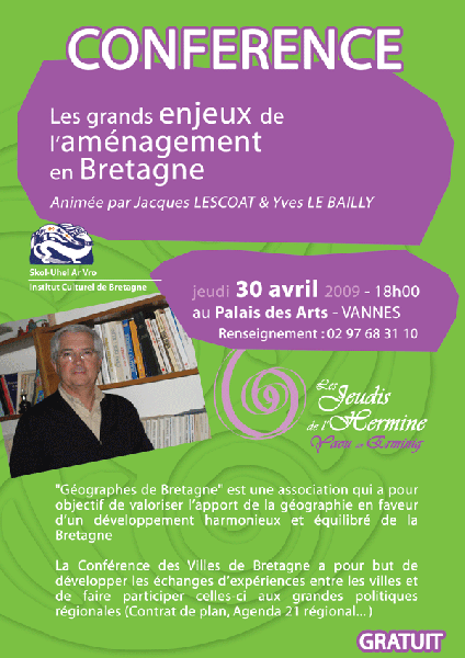 CONFERENCE – LES JEUDIS DE L'HERMINE Jeudi 30 avril à 18h00 au Palais des Arts de Vannes - GRATUIT Les grands enjeux de l'aménagement en Bretagne Par Jacques