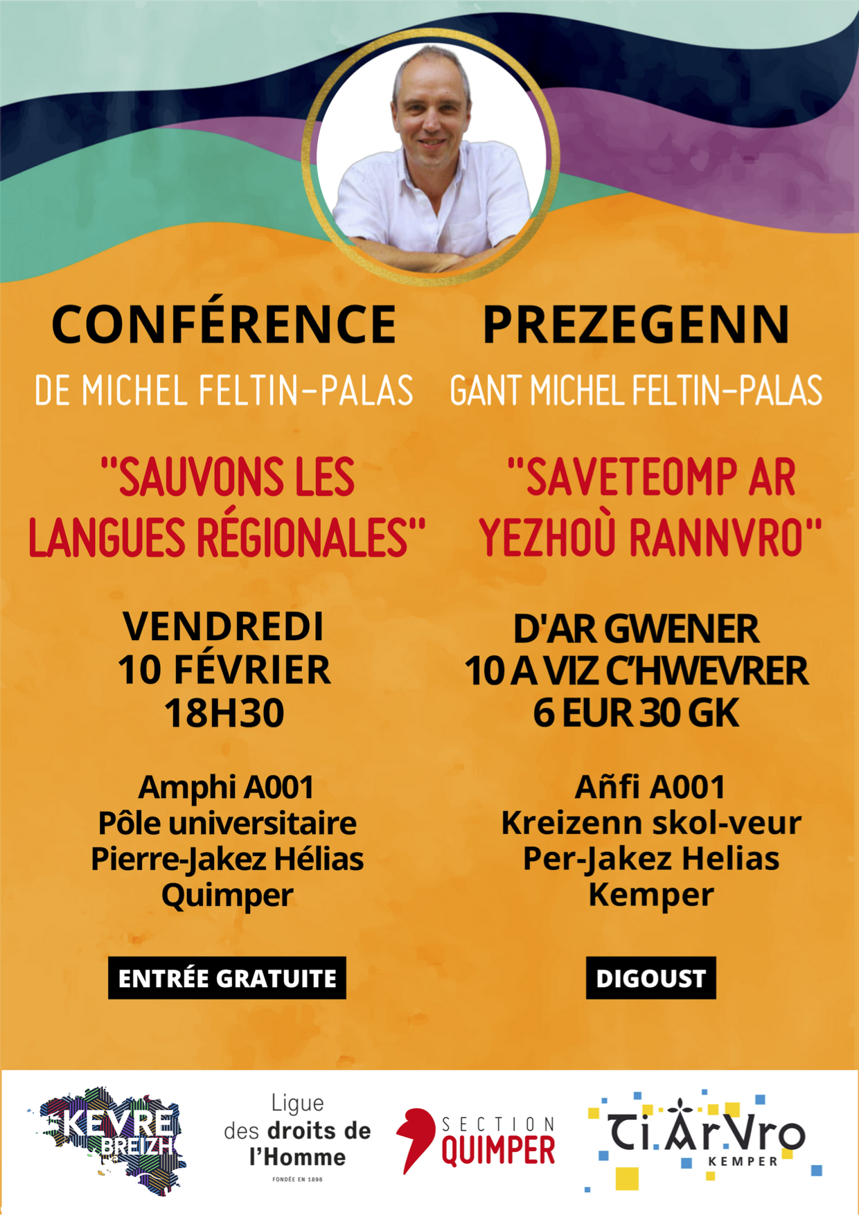 La conférence de Michel Feltin-Palas se tiendra vendredi 10 février à 18h30 dans l’amphi A001 du Pôle universitaire Pierre-Jakez Hélias à Quimper. Entrée gratuite. L’article Conférence « Sauvons les langues régionales » est apparu en premier sur Institut culturel de Bretagne.