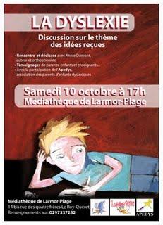Dans le cadre de la journée mondiale de la Dyslexie, la médiathèque de Larmor-Plage et la Librairie Louise TITI vous proposent de rencontrer l'auteure et l'Orthophoniste, Annie DUMONT, pour une présentation de son livre sur "La dyslexie - idées reçues" à la médiathèque de Larmor-Plage 14 bis rue des quatre frères Le Roy-Quéret le samedi 14 octobre 2009 à 17 H. Cette rencontre est organisée par la