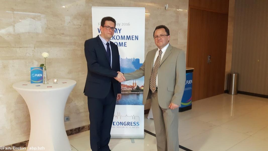 Ce congrès a été l'occasion pour le Parti Breton de faire connaître la Bretagne et de rappeler les problématiques culturelles et politiques inhérentes au contexte français. Les échanges fructueux nous ont éclairé sur les différentes situations des minorités en Europe et sur le retard démocratique de la France. Le maire de Wroclaw, Rafal Dutkiewicz, a accueilli en personne l'assemblée, ainsi que le vice-ministre de l'intérieur polonais Sebastian Chwalek, la Haut Commissaire aux réfugiés en Pologne, Astrid Thors, le commissaire du gouvernement fédéral allemand aux minorités allemandes, Harmut Koschyk et le député représentant la minorité allemande au parlement polonais, Bernard Gaida. La Pologne a, à la différence de la France, signé la charte européenne des langues régionales et minoritaires. A ce titre, elle reconnaît les minorités, dont elle doit faciliter l'enseignement des langues. Dans le cas des Allemands, organisateurs du congrès avec l'association VdG, en 1990 a été signé un traité confirmant les frontières actuelles et en 1991 un traité de bon voisinage concernant notamment les minorités. Depuis 2008, la minorité allemande est représentée par un député au Parlement. Ce congrès a été l'occasion de rappeler la situation en Ukraine et la responsabilité de l'Europe dans la crise des migrants qui a atteint une ampleur inégalée depuis début 2015. Il a été rappelé le devoir d'aide humanitaire qui est le nôtre pour les réfugiés chassés de leurs foyers par la guerre. Toutefois des divergences d'analyse existent entre les pays d'Europe centrale qui ont déjà nombre de leurs nationaux qui vivent en exil pour trouver du travail et les représentants des institutions Européennes, concernant la prise en charge de ces réfugiés par les différents pays européens. Lorant Vincze a été élu président du FUEN pour succéder à Hans Heinrich Hansen. Il connaît la Bretagne pour avoir répondu à l'invitation de l'Institut culturel de Bretagne il y a 3 ans. Il est membre du RDMSZ (parti démocratique hongrois de Roumanie). Thierry Salaun Membre du Conseil national du Parti Breton en charge des relations internationales