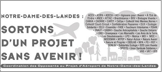 La Coordination des opposants à l'aéroport de Notre-Dame des Landes : plus de 50 groupes : associations, collectifs, syndicats et mouvements politiques (2), a décidé, après discussion lors de sa réunion exceptionnelle du 31 mars 2016, de dénoncer haut et fort la mascarade que représente cette consultation mais d'appeler aussi les citoyens à aller voter massivement NON pour ne pas laisser le champ libre aux porteurs du projet.