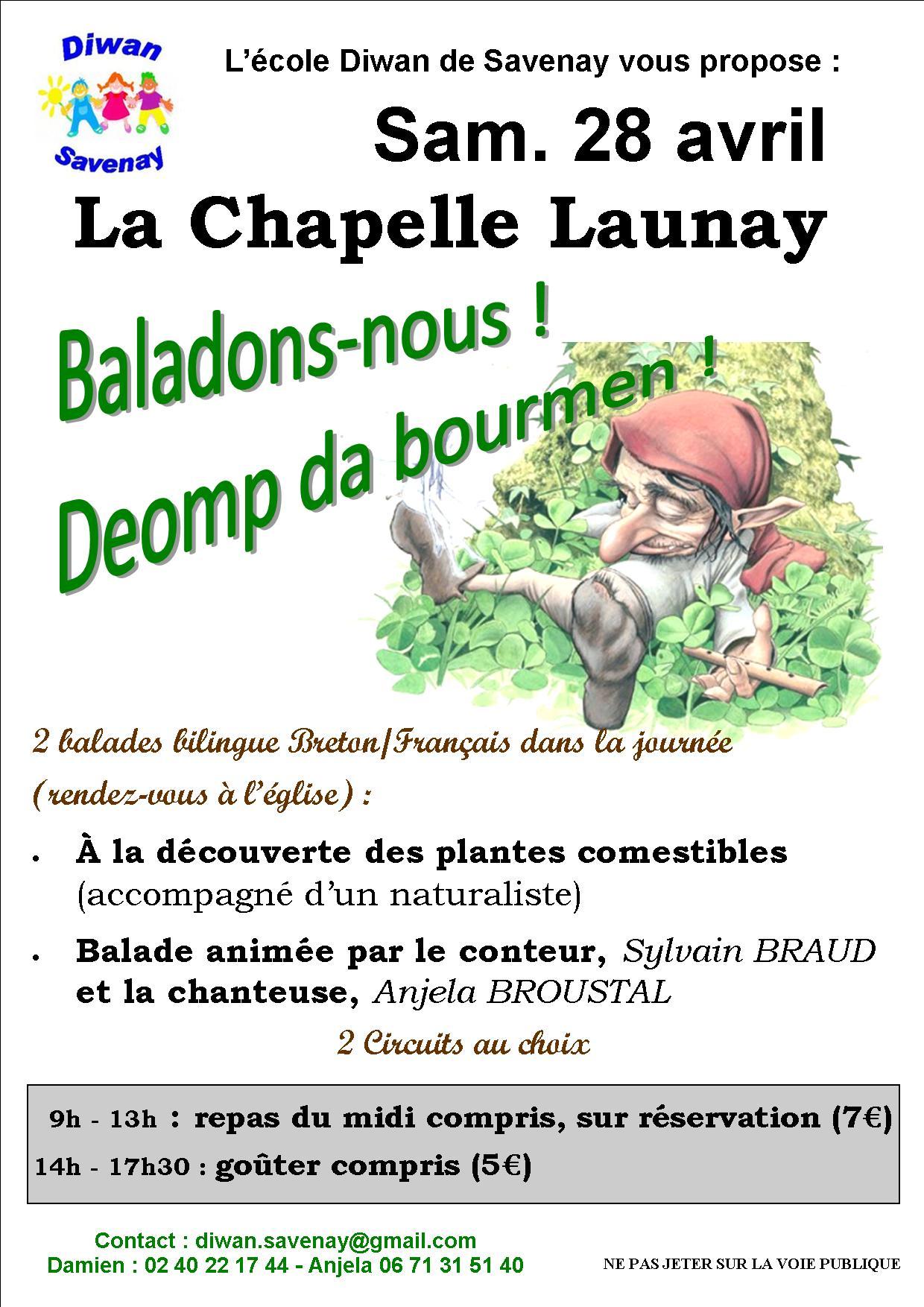 Samedi 28, La-Chapelle-Launay : Baladons-nous! Deomp da bourmen ! Deux balades bilingues dans la journée « A la découverte des plantes comestibles » accompagné d'un naturaliste, et « Balade animée » par le conteur Sylvain Braud et la chanteuse Anjela Broustal, rendez-vous devans l'église. Deux circuits au choix : 9h-13h repas compris, sur réservation : 7 euros, 14h-17h30 goûter compris : 5 euros. Rens. École Diwan de Savenay : Damien : 02 40 22 17 44 – Anjela : 06 71 31 51 40 – diwan.savenay@gmail.com