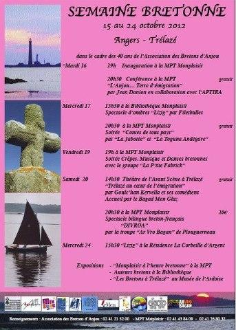 Du 15 au 24 octobre, Angers - Trélazé : SEMAINE BRETONNE organisée par l'Association Les Bretons d'Anjou et la Maison Pour Tous de Monplaisir, 3 rue de l'écriture Angers. Rens. 02 41 21 52 00 - bretons49@free.fr - 02 41 43 84 09 (MPT) - O2 41 76 80 32 (Fañch Mahé)