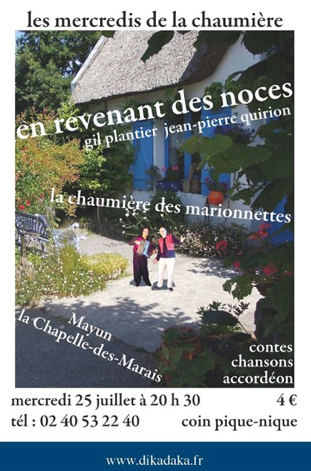 Mercredi 25, La Chapelle-des-Marais : Spectacle " En revenant des noces " avec Gil Plantier et Jean-Pierre Quirion, un conteur, un musicien, deux voix, un accordéon, à la Chaumière des marionnettes, Mayun, 20 h 30. Tarif : 4 €.