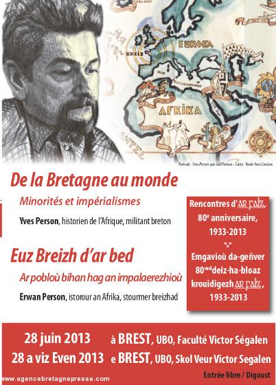 Il se trouve que le mouvement culturel Ar Falz fête ses 80 ans et organise à Brest une journée d\'études. Après une évocation de l\'ouverture au monde du fondateur du mouvement, l\'instituteur Yann Sohier (mort en 1935), l\'occasion était idéale pour centrer cette journée sur Yves Person , ancien membre actif du mouvement, la Bretagne et l\'Afrique. Plusieurs universitaires africains viendront à Brest. Un film sur la vie et l\'oeuvre d\'Yves Person sera projeté en avant première. Des militants bretons témoigneront aussi de l\'engagement breton d\'Yves Person. Henri Giordan et Yves Plasseraud viendront témoigner de ses engagements pour un vrai respect des minorités dans l\'État français et en Europe.