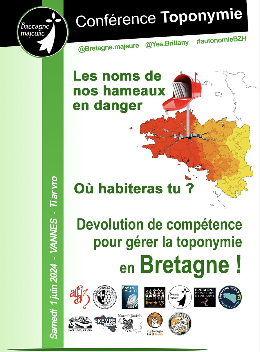 Le 1er juin, à Ti ar vro Gwened, Vannes, 14h, aura lieu une conférence sur la toponymie bretonne en danger organisée par de nombreuses associations bretonnes. L'application de la loi 3DS conduit à la débretonnisation de notre territoire. Nous tenterons de dresser l'état des lieux et de mettre en place des solutions permettant de réparer.