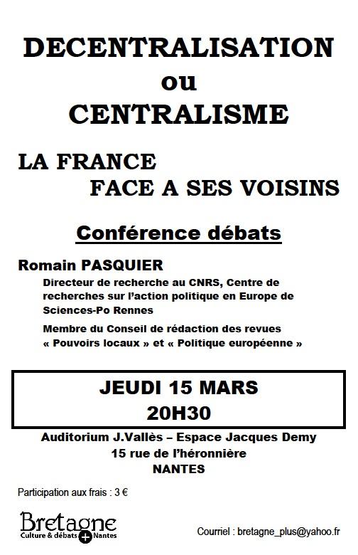 L'Association Bretagne Plus Culture et Débats organise cette soirée sur le thème suivant : De l'ancien régime à la République présidentielle, en passant par l'Empire, le centralisme est une constante dans l'exercice du pouvoir en France. Dans le contexte actuel qui bouleverse nos sociétés ce mode de gouvernance est-il