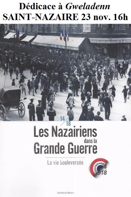 Une rencontre-dédicace est programmée à la librairie Gweladenn vendredi 23 novembre, de 16 h à 18 h 30 pour le livre Les Nazairiens dans la Grande Guerre. La vie bouleversée avec plusieurs représentants du collectif Saint-Nazaire Histoire.