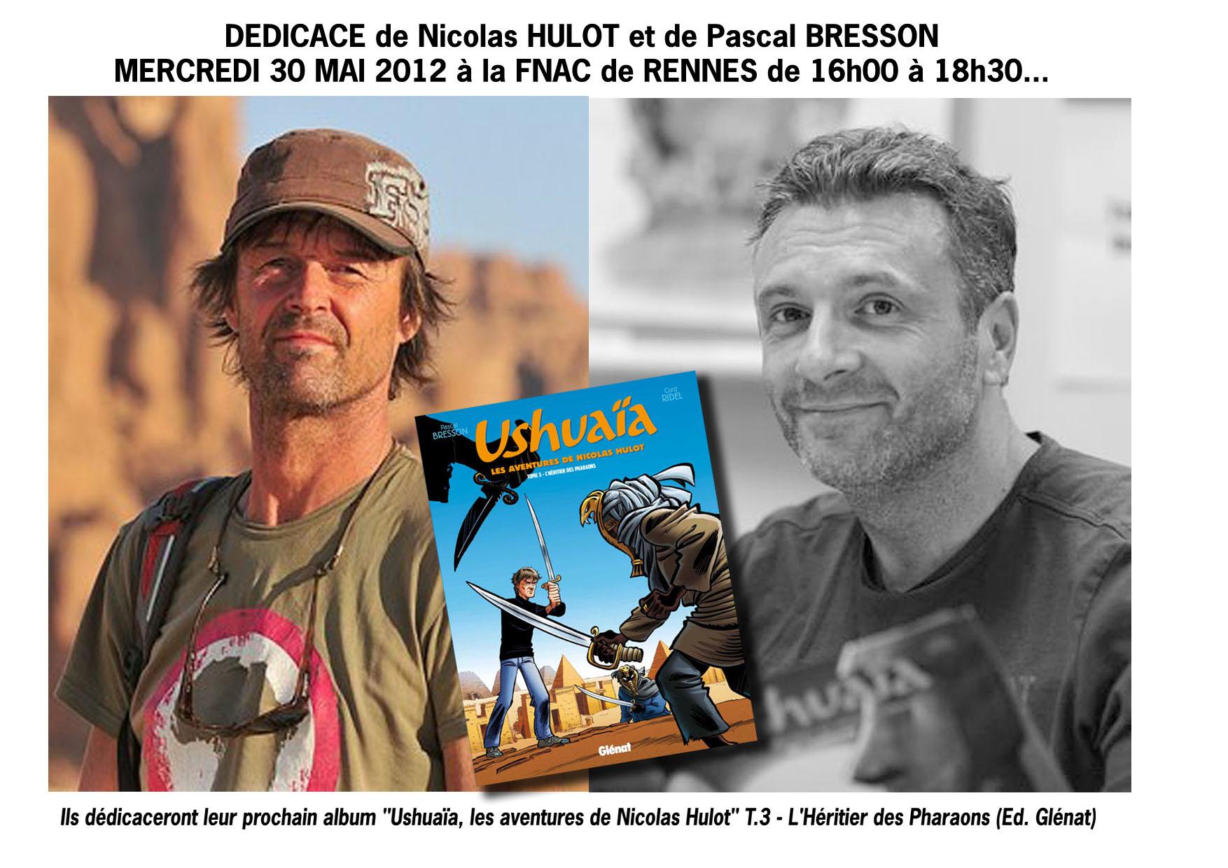 Mercredi 30 mai 2012, à la Fnac de Rennes de 16 h à 18 h 30, sortie en avant-première de la bande dessinée "Ushuaïa, les Aventures de Nicolas Hulot" T. 3 - L'Héritier des Pharaons - Éditions Glénat.
